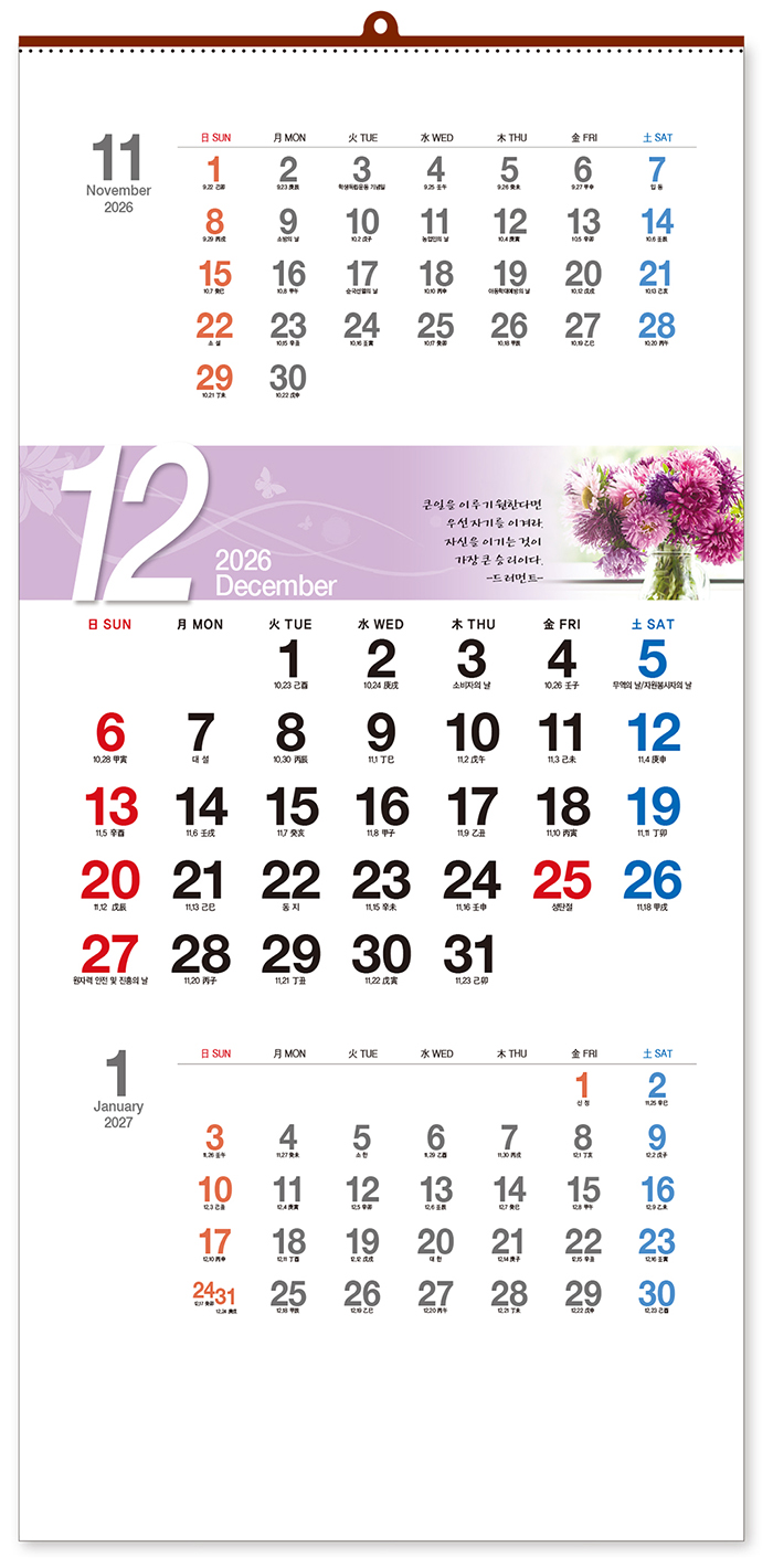 1-513 꽃의 속삭임 305mm x 630mm x 13매 관련링크 목록 본문 • 상호란 : 240mm x 50mm• 제본 : 금구• 인쇄 : 옵셋 4도• 지질 : 스노우화이트 120g원터치 뜯김으로 깔끔하게 사용가능• 본 카렌다에는 음력 · 일진 · 절후가 표기되어 있습니다. 이전 다음