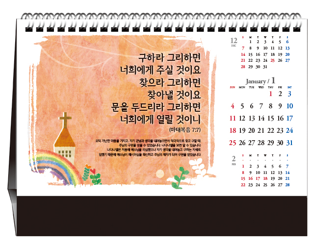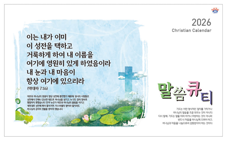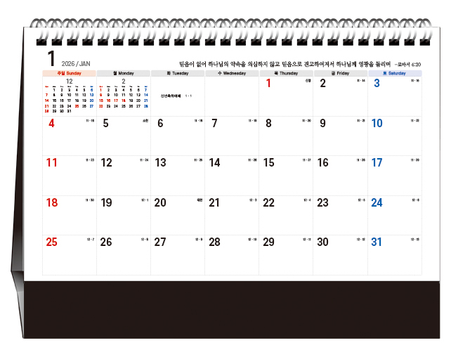 172 말씀큐티 260 x 190mm / 14매 관련링크 목록 본문 • 용지 : 아트지• 제본 : 트윈스프링• 작업란 : 200mm x 20mm교회명은 은박인쇄본 카렌다에는 기념일, 음력,절기,교회력이 표기되어 있습니다. 이전 다음