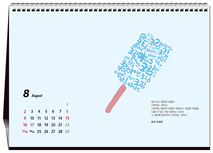 1-206 하루 쉼표 297mm x 210mm x 15매 관련링크 목록 본문 • 상호란 : 200mm x 25mm(내지인쇄, 100부이상)• 제본 : TW스프링,STAND 크로스합지• 인쇄 : 옵셋 8도• 지질 : 고급 특수지• 본 카렌다에는 음력-절후가 표기되어 있습니다. 이전 다음